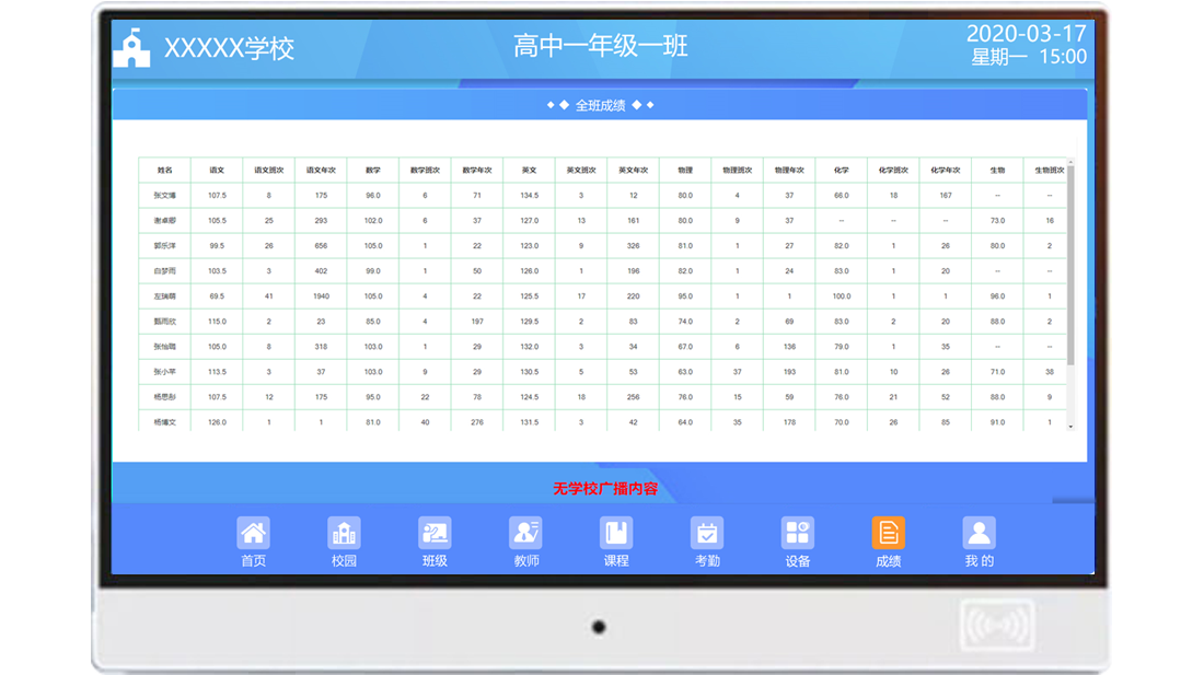 成績部分顯示全班同學各科成績及總成績,在班級、年級的排名情況等信息。